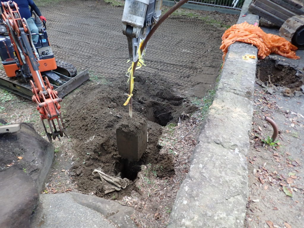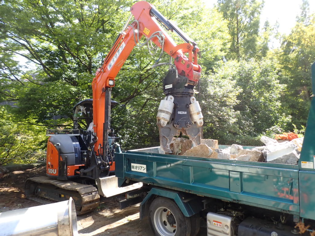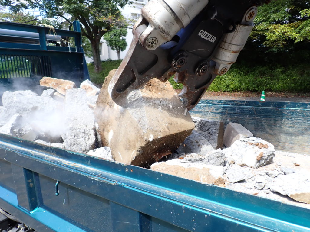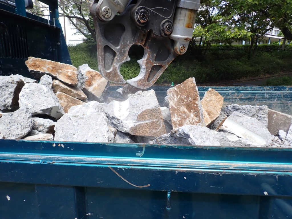 遊具基礎はサイズがあるのでコンクリ破砕用アタッチメント(通称・大割り)で現場にて細かくし、産廃処分施設へ運搬しました。