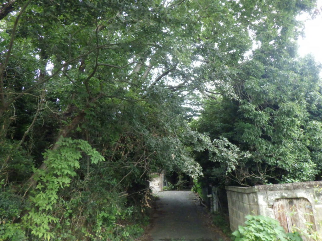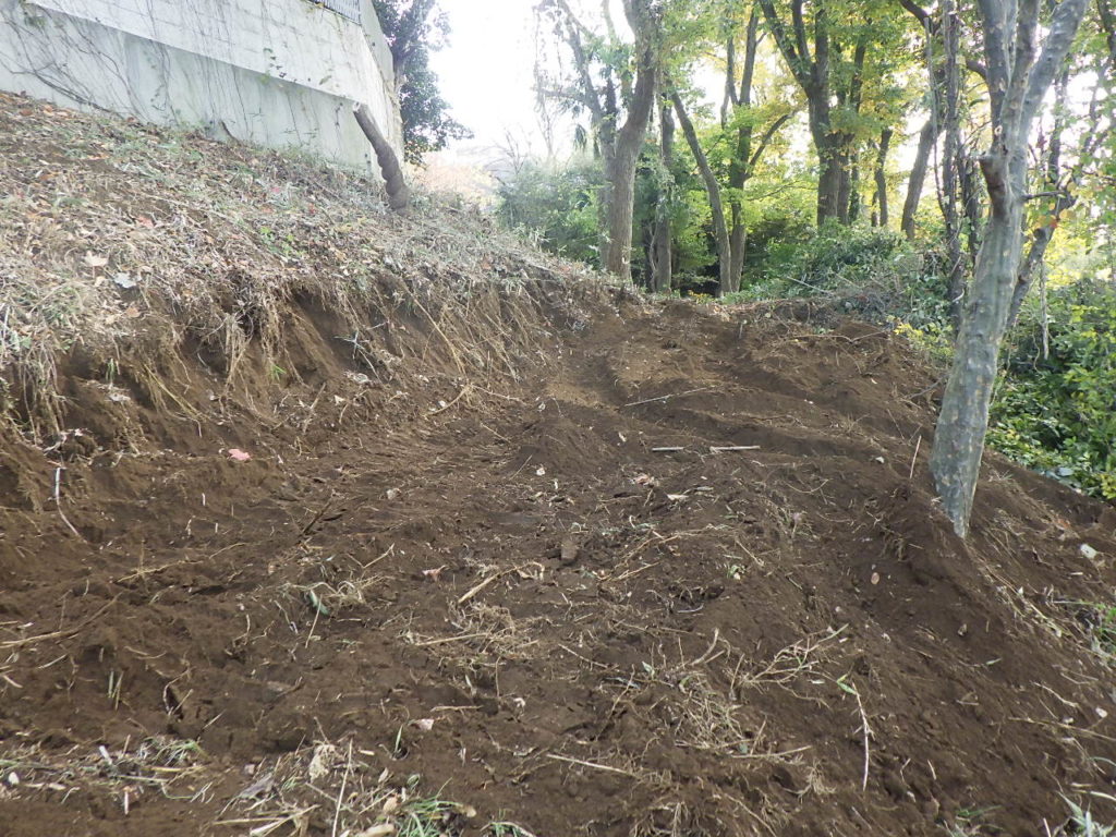 傾斜のある緑地帯内に重機移動用の道を作ります。